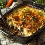 If I’m using mashed potatoes, I spread them on top during the last 10 minutes of baking and sprinkle with cheese if I want a golden topping.