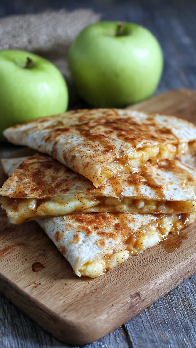I lay out one tortilla and spread a thin layer of cream cheese or sprinkle cheese if using. I spoon the warm apple filling over half of the tortilla, then fold it over like a quesadilla.