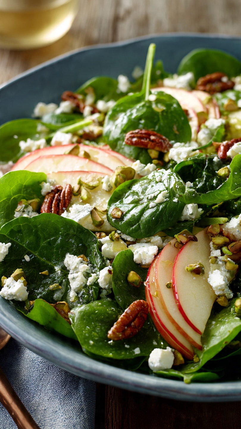A bright, fresh apple spinach salad with feta, pistachios, and a tangy honey-mustard lemon dressing. It’s quick, flavorful, and full of texture—perfect as a side or light main dish.
