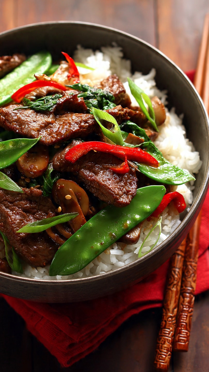 A quick and flavorful Asian stir-fry featuring tender beef, mushrooms, and crisp snow peas tossed in a savory soy-garlic sauce. Perfect for busy weeknights and better than takeout.