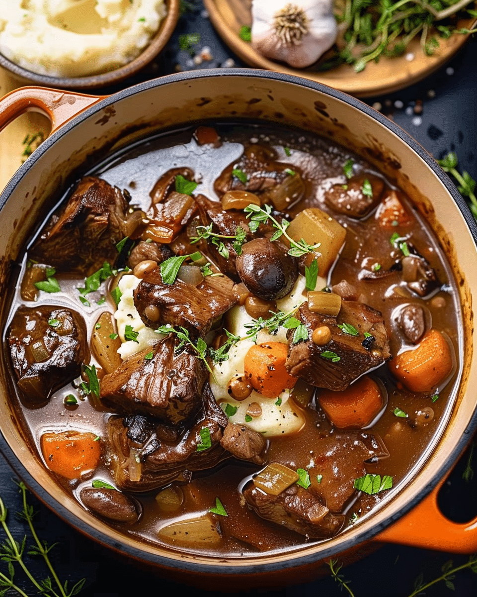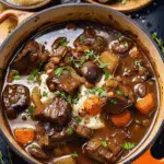 Autumn Beef Bourguignon is a warm, rustic, and deeply flavorful stew that’s perfect for crisp, chilly evenings. I simmer tender chunks of beef with red wine, earthy vegetables, fresh herbs, and mushrooms to create a rich, velvety sauce that clings to every bite. It’s a classic French-inspired comfort dish, and I love how it fills my kitchen with the cozy aroma of fall.