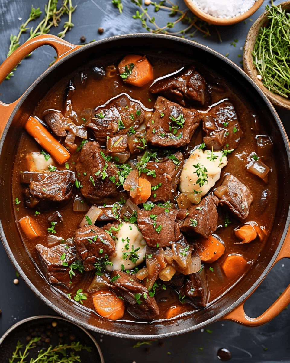 I love this recipe because it delivers all the richness and depth of a traditional beef bourguignon. The flavors still build beautifully thanks to a good sear on the beef, the slow simmer, and the addition of garlic, herbs, and wine. The mushrooms and pearl onions give it texture and body, and the wine-based broth becomes silky and complex. It’s one of those dishes that feels like a hug in a bowl.