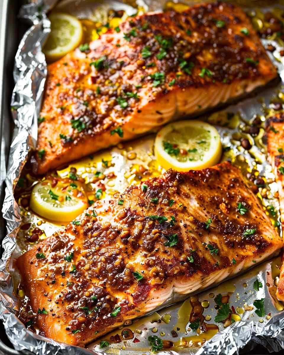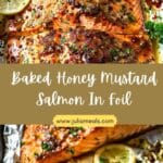 A simple and flavorful baked salmon dish coated in a sweet and tangy honey mustard glaze, cooked in foil to keep it tender, juicy, and perfectly moist.