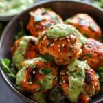 I store the meatballs and sauce separately in airtight containers in the fridge for up to 3 days. To reheat the meatballs, I use the oven or air fryer so they stay crisp. The avocado sauce is best fresh but holds up for a day or two if tightly covered to prevent browning.
