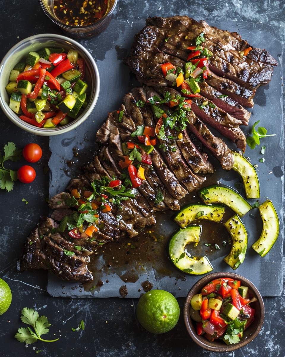 Balsamic skirt steak with red pepper relish and zucchini salad is a bold, colorful dish that’s perfect when I want something fresh and satisfying. The steak is marinated in a tangy balsamic blend, then grilled or pan-seared until juicy and flavorful. It’s paired with a sweet and savory red pepper relish and a crisp zucchini salad that balances the richness of the meat.