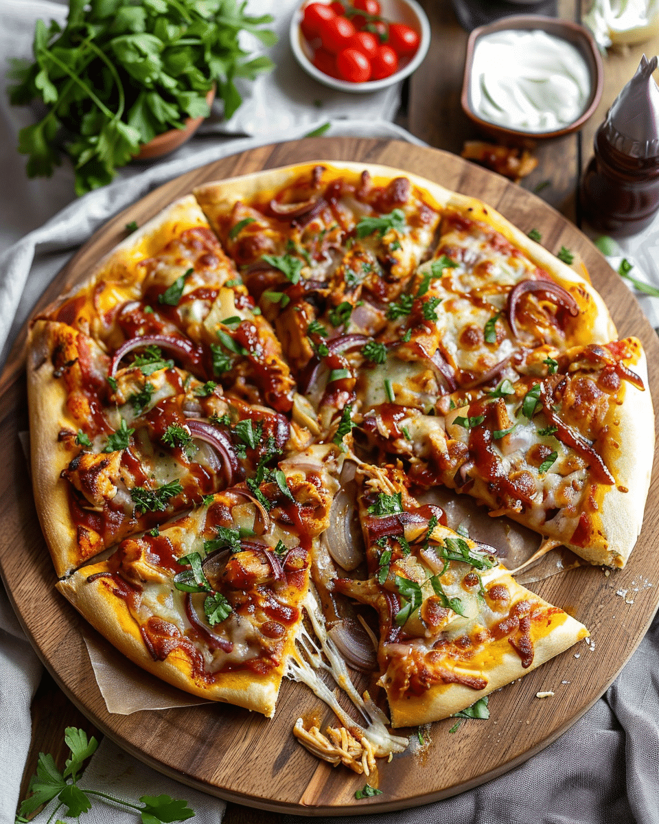 BBQ Chicken Pizza is a bold and flavorful twist on traditional pizza, featuring tangy barbecue sauce, tender chicken, melty cheese, and fresh herbs on a crispy crust. It’s quick to prepare and perfect for weeknight dinners or casual gatherings.