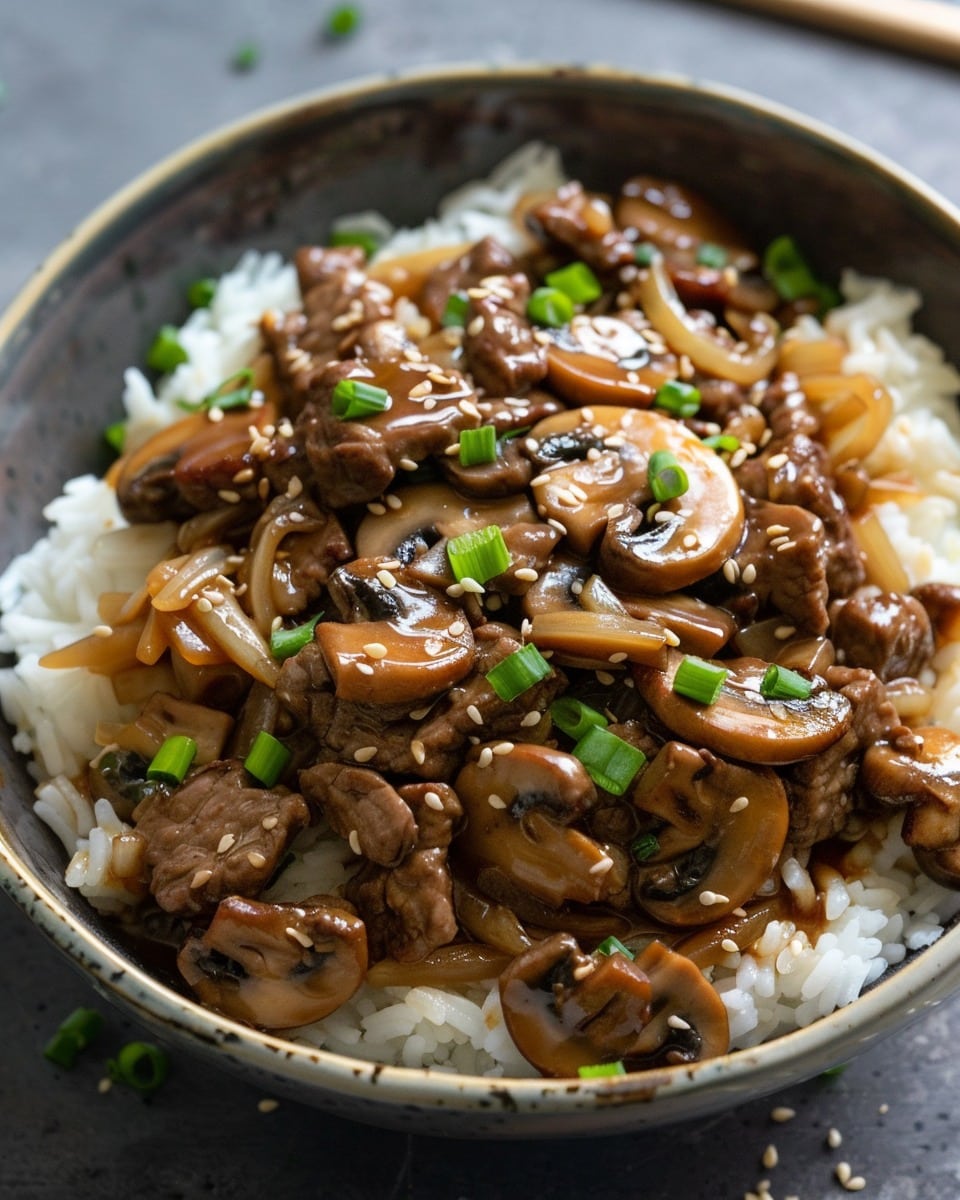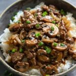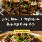 This Beef, Onion & Mushroom Stir-Fry Over Rice is a comforting and savory dish made with tender beef, caramelized onions, and earthy mushrooms, all coated in a rich sauce and served over warm rice.