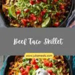 A bold and hearty one-pan beef taco skillet packed with seasoned ground beef, beans, corn, tomatoes, and melty cheese for a quick and comforting meal.