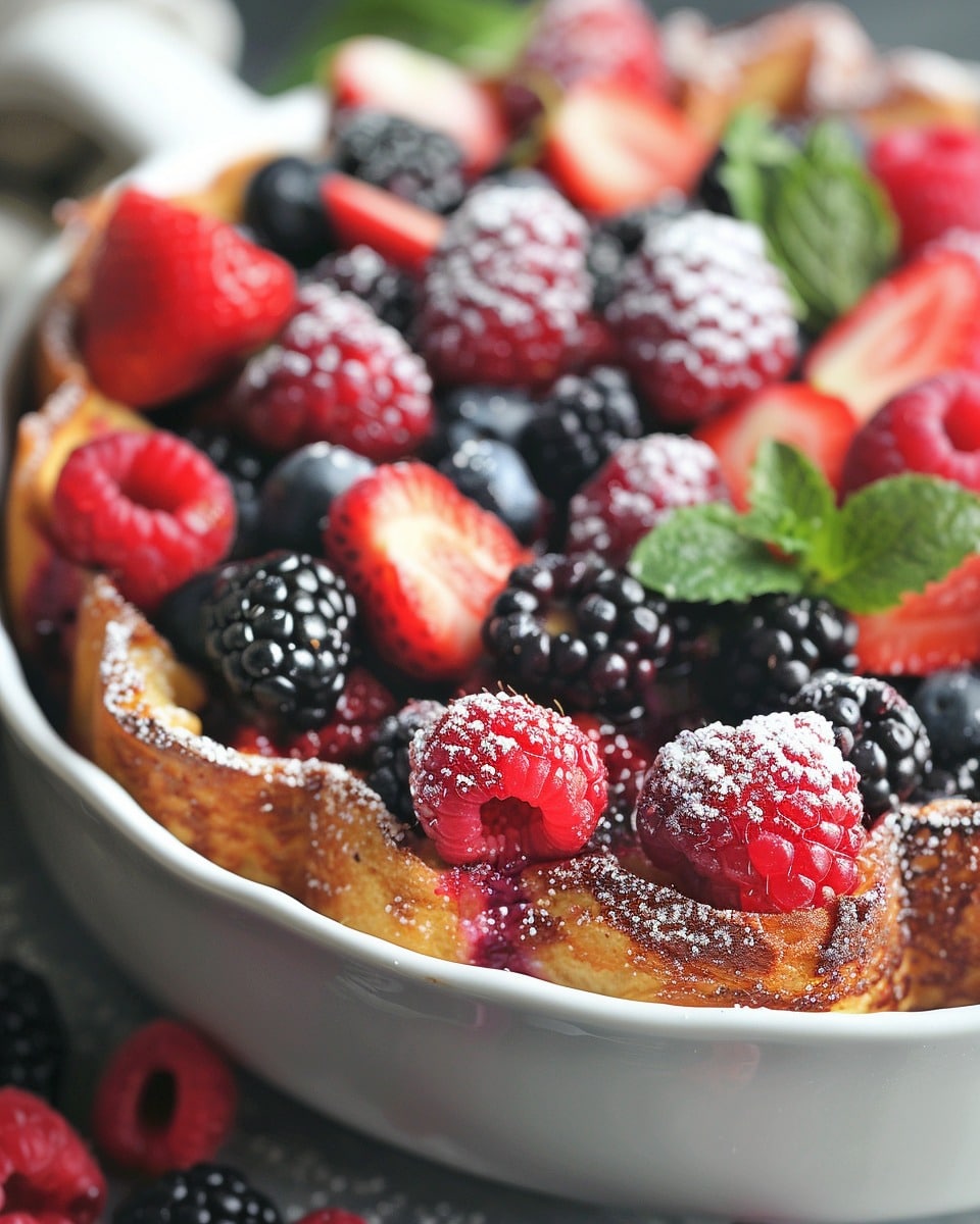 Sometimes I add a cream cheese swirl by dotting small pieces of softened cream cheese between the layers. I’ve also swapped the berries for sliced bananas and added chocolate chips for a fun twist. If I want to make it dairy-free, I use almond or oat milk and skip the cream. For a nutty crunch, I top it with slivered almonds or pecans before baking.