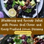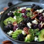Blackberry and Avocado Salad with Pecans, Goat Cheese, and Honey Mustard Lemon Dressing is a refreshing, colorful salad loaded with texture and bold flavor. Sweet blackberries, creamy avocado, crunchy pecans, and tangy goat cheese sit on a bed of greens, all tied together with a zesty honey mustard lemon vinaigrette.