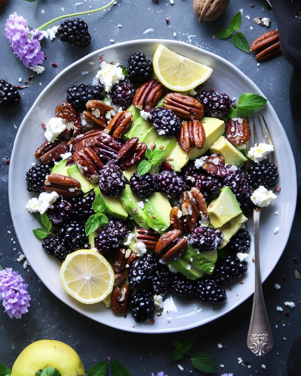 Blackberry and Avocado Salad with Pecans, Goat Cheese, and Honey Mustard Lemon Dressing is a fresh, vibrant, and flavorful dish that brings together sweet, creamy, crunchy, and tangy in every bite. I toss juicy blackberries, buttery avocado slices, crunchy pecans, and tangy goat cheese over crisp greens, then drizzle it all with a bright honey mustard lemon vinaigrette that ties everything together beautifully.
