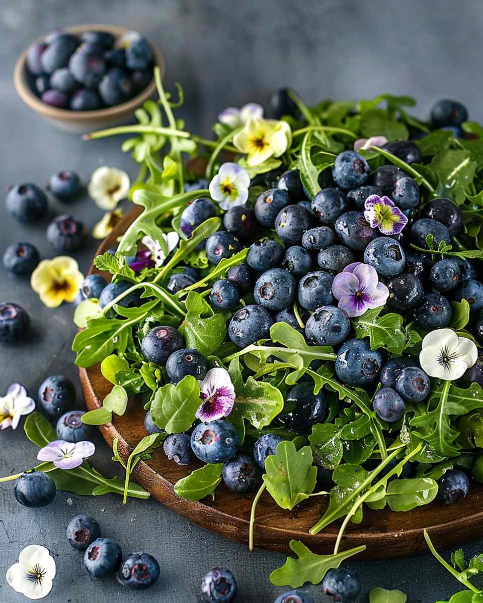 A fresh and vibrant blueberry arugula herb salad combining sweet berries, peppery greens, creamy cheese, and crunchy nuts with a light tangy dressing.