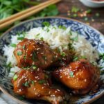 I serve the chicken hot over a bowl of rice, spooning the flavorful broth over the top.