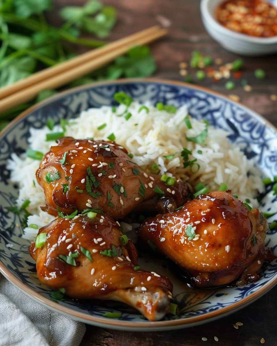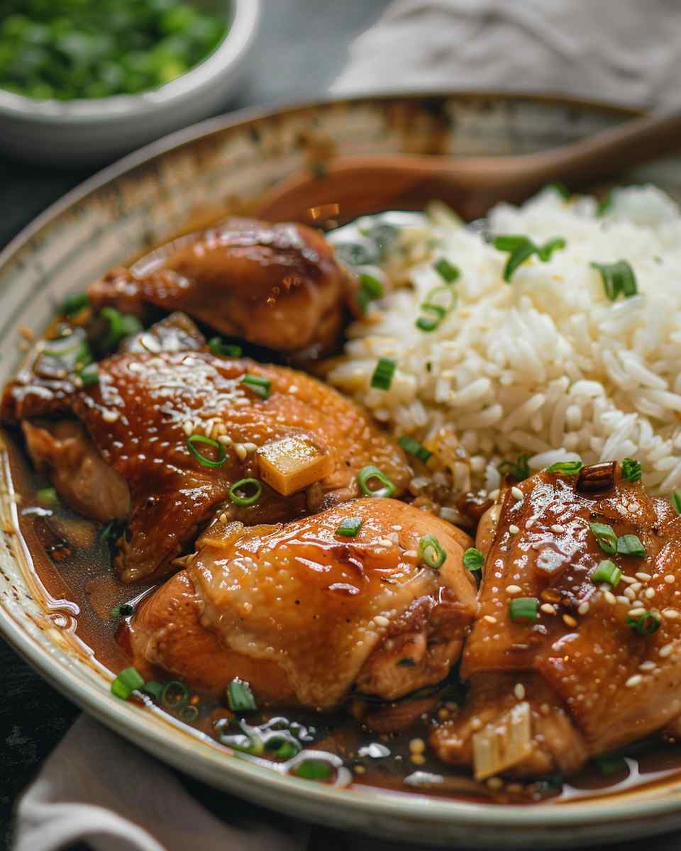 A comforting dish featuring caramelised soy-glazed chicken simmered in a fragrant garlic ginger broth, served over rice for a rich and satisfying meal.