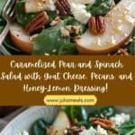 Caramelized Pear And Spinach Salad With Goat Cheese, Pecans, And Honey-Lemon Dressing is a fresh and elegant dish that combines warm, sweet pears with tender spinach, tangy goat cheese, and crunchy pecans. The light honey-lemon dressing ties everything together for a flavorful and balanced salad.