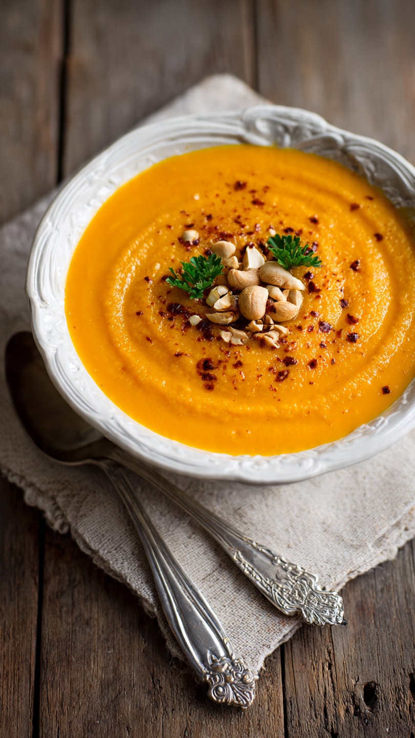 A creamy and nourishing cashew carrot ginger soup made without dairy, combining sweet carrots, rich cashews, and warming ginger into a smooth, comforting bowl.
