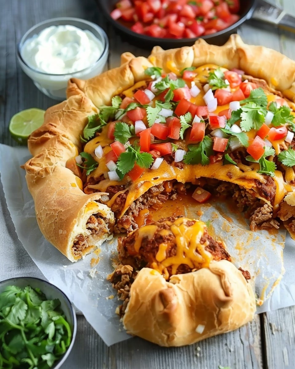 Cheesy Mini Taco Bake Ring is a fun, crowd-pleasing appetizer or meal that combines everything I love about tacos—savory meat, gooey cheese, and zesty toppings—wrapped in golden crescent dough. Baked in a circular pattern, this pull-apart taco ring is not only delicious but also visually impressive and super easy to serve. It’s perfect for game day, parties, or just a playful dinner that gets everyone reaching for a slice.