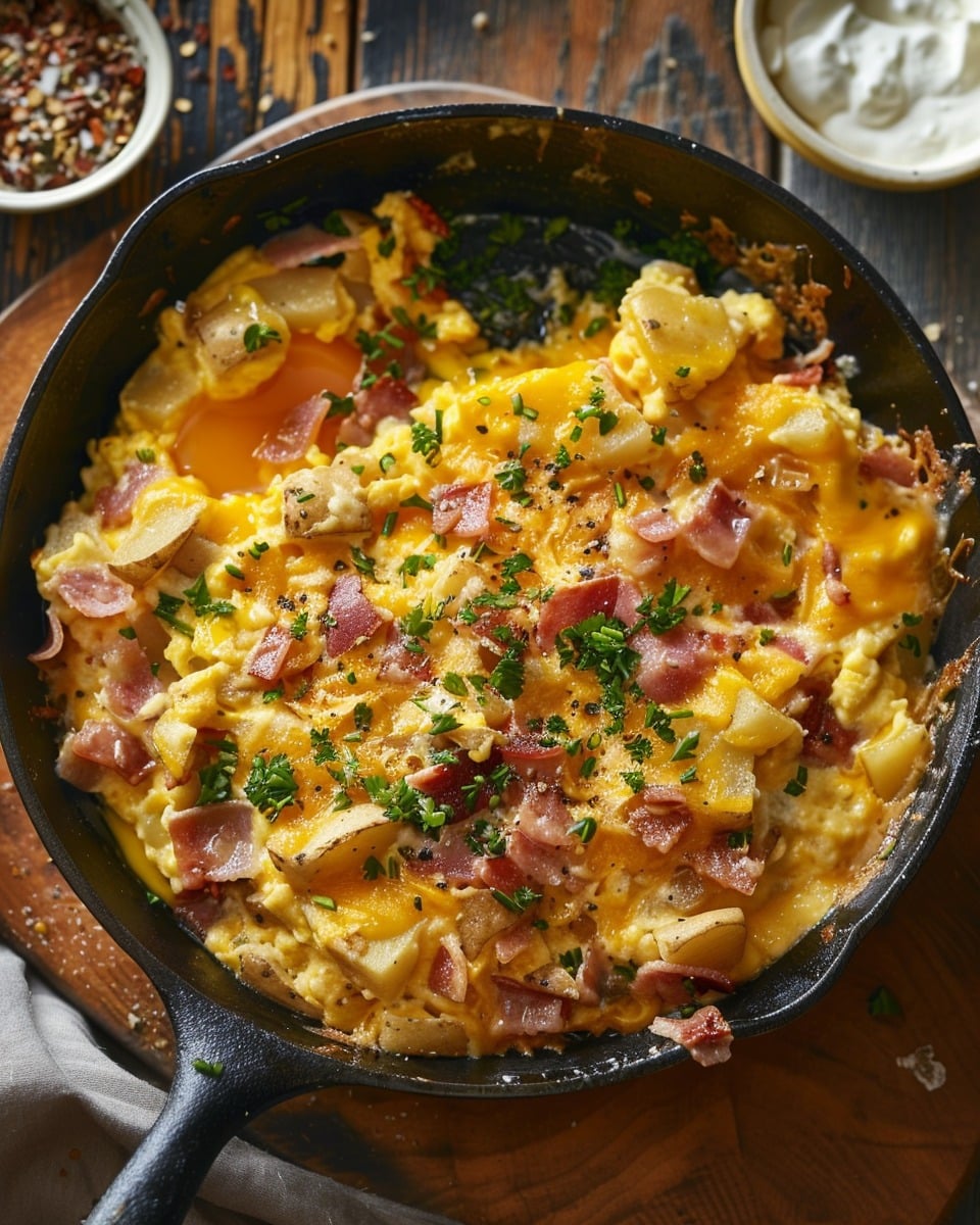 I love how quick and customizable this recipe is. It’s a great way to use up leftover potatoes or veggies, and I can easily scale it for one or for a crowd. The cheese adds a creamy richness that pairs perfectly with the soft scrambled eggs and crispy potatoes. Whether I need a lazy weekend brunch or a weekday breakfast-for-dinner, this dish hits the spot every time.