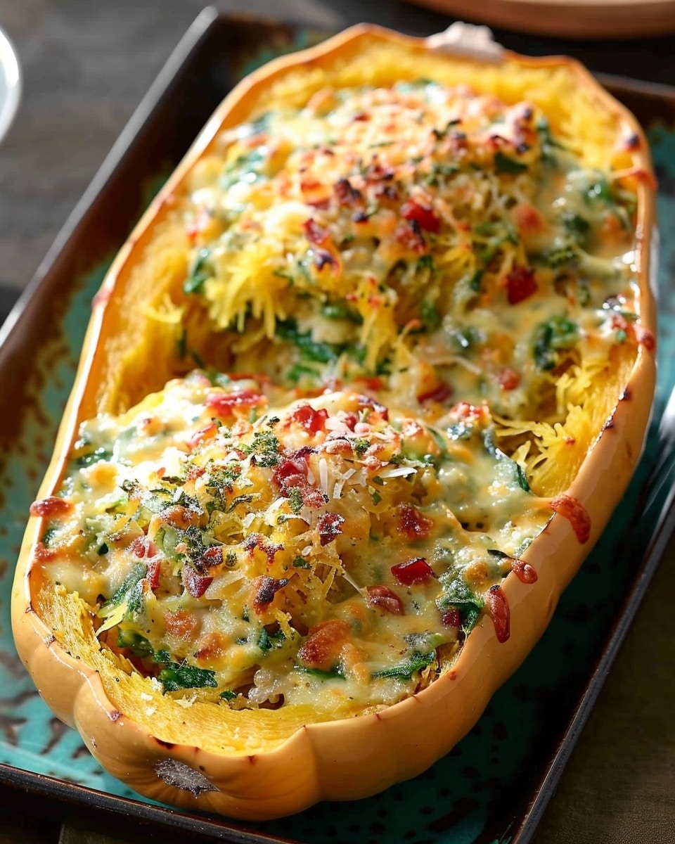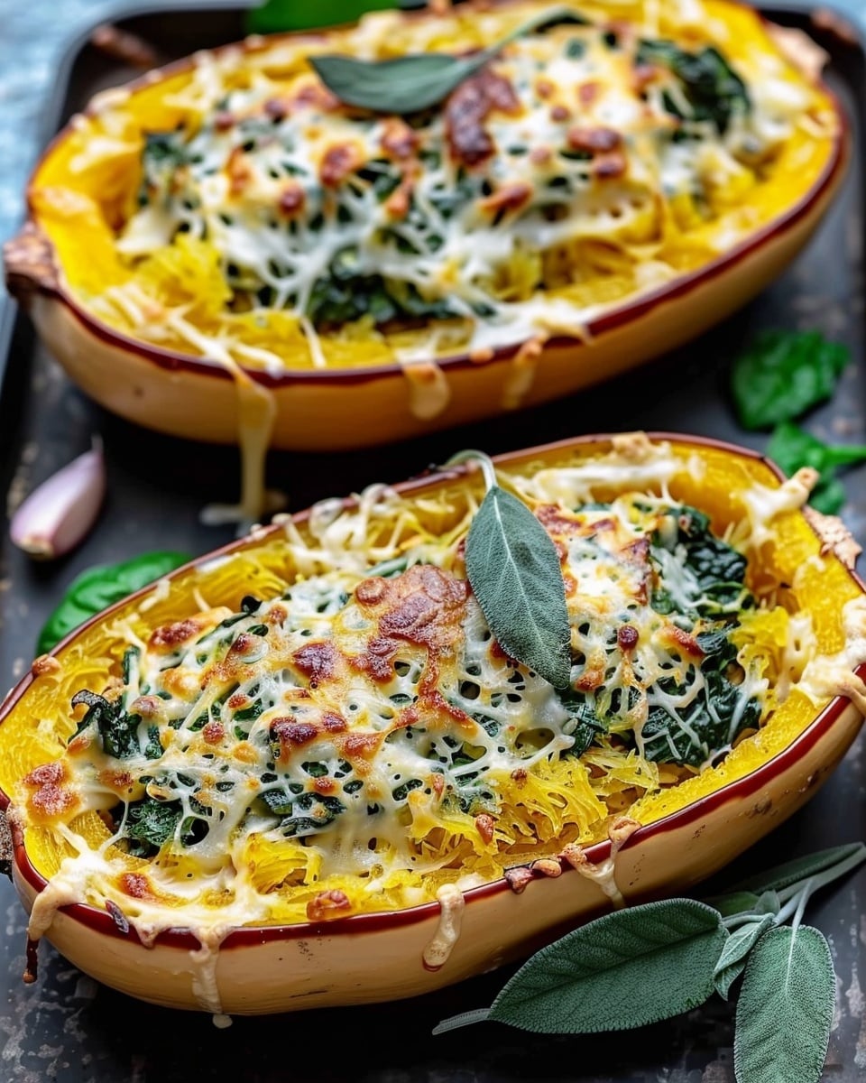 PrintCheesy Spinach Stuffed Spaghetti Squash