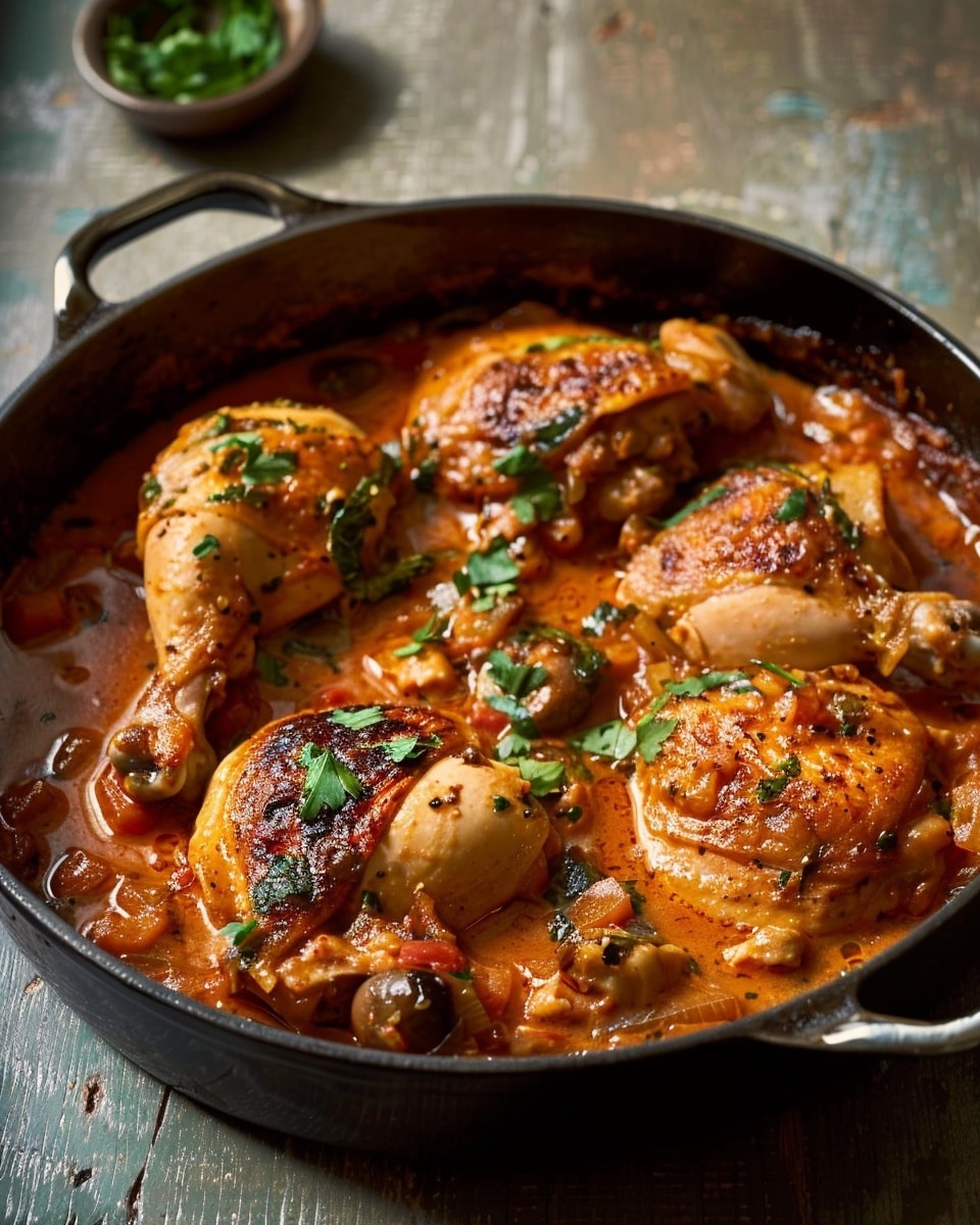 In a large skillet or Dutch oven, I heat olive oil over medium-high heat and sear the chicken skin-side down until golden brown. I flip and brown the other side, then remove the chicken and set it aside.