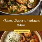 A rich and comforting Southern-inspired gumbo made with tender chicken, juicy shrimp, and earthy mushrooms simmered in a deeply flavorful broth. Thickened with a classic roux, this hearty dish is perfect for cozy dinners or gatherings.