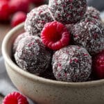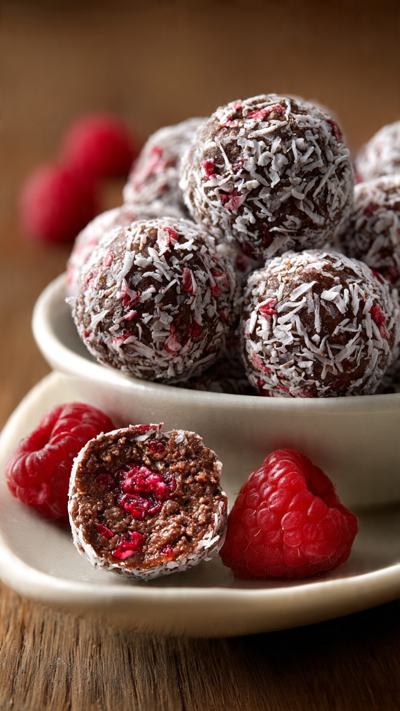 No-bake chocolate chia raspberry bites made with wholesome ingredients, rich cocoa flavor, and tangy raspberries—perfect for healthy snacking or a quick energy boost.
