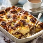 Chocolate Croissant Breakfast Bake is a rich and indulgent morning treat made by layering buttery croissants with chunks of chocolate and soaking them in a sweet custard before baking until golden and gooey. It’s like a cross between bread pudding and a chocolate croissant, and I love serving it warm when I want to impress without much effort.