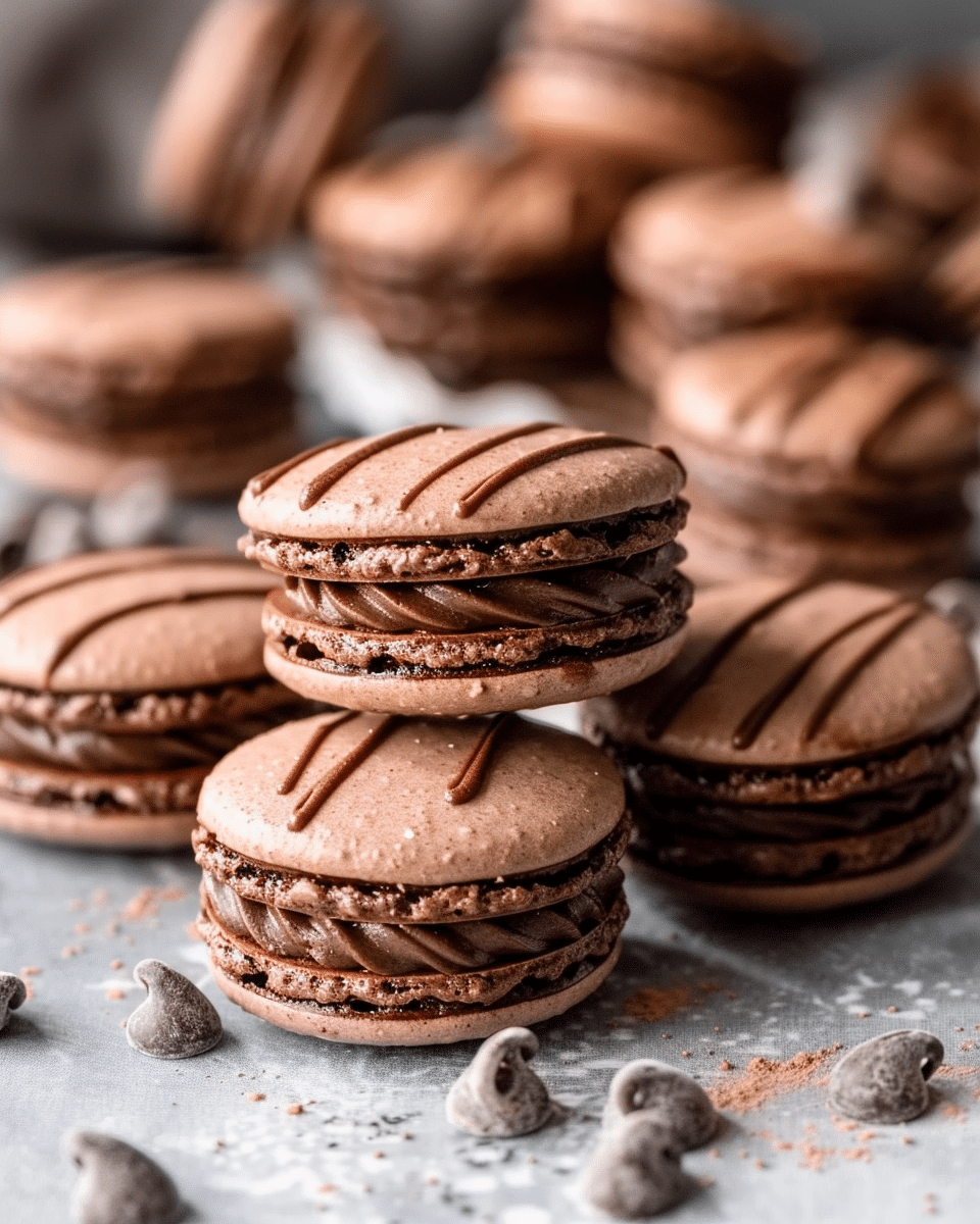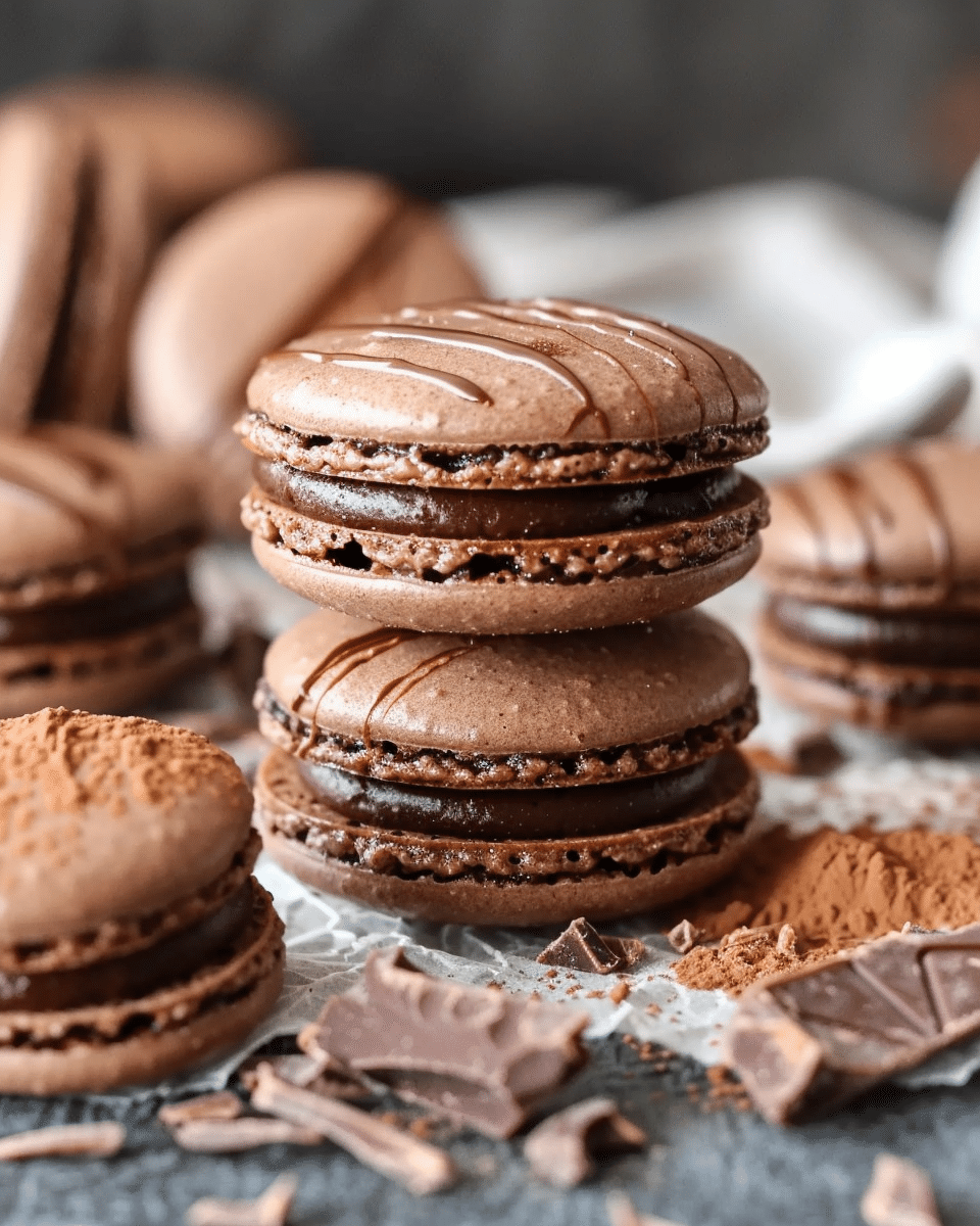 Chocolate ganache macarons are elegant French cookies with crisp almond meringue shells and a luscious dark chocolate ganache filling. These delicate treats combine a lightly chewy texture with a rich, smooth center—perfect for special occasions or homemade gifting.