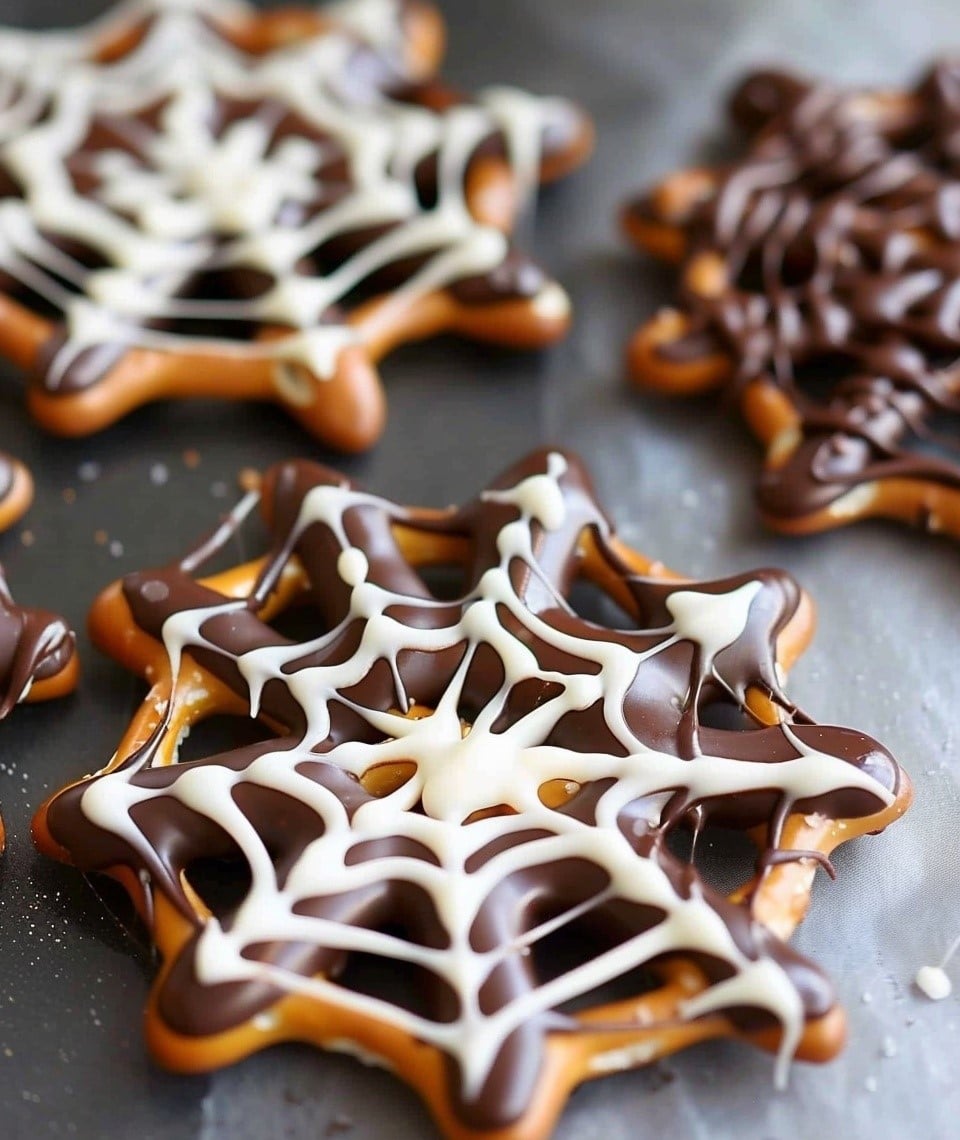 - Using a spoon or piping bag, I drizzle or pipe the white chocolate over the center of the pretzels to connect them, then spiral outward to form the web shape.