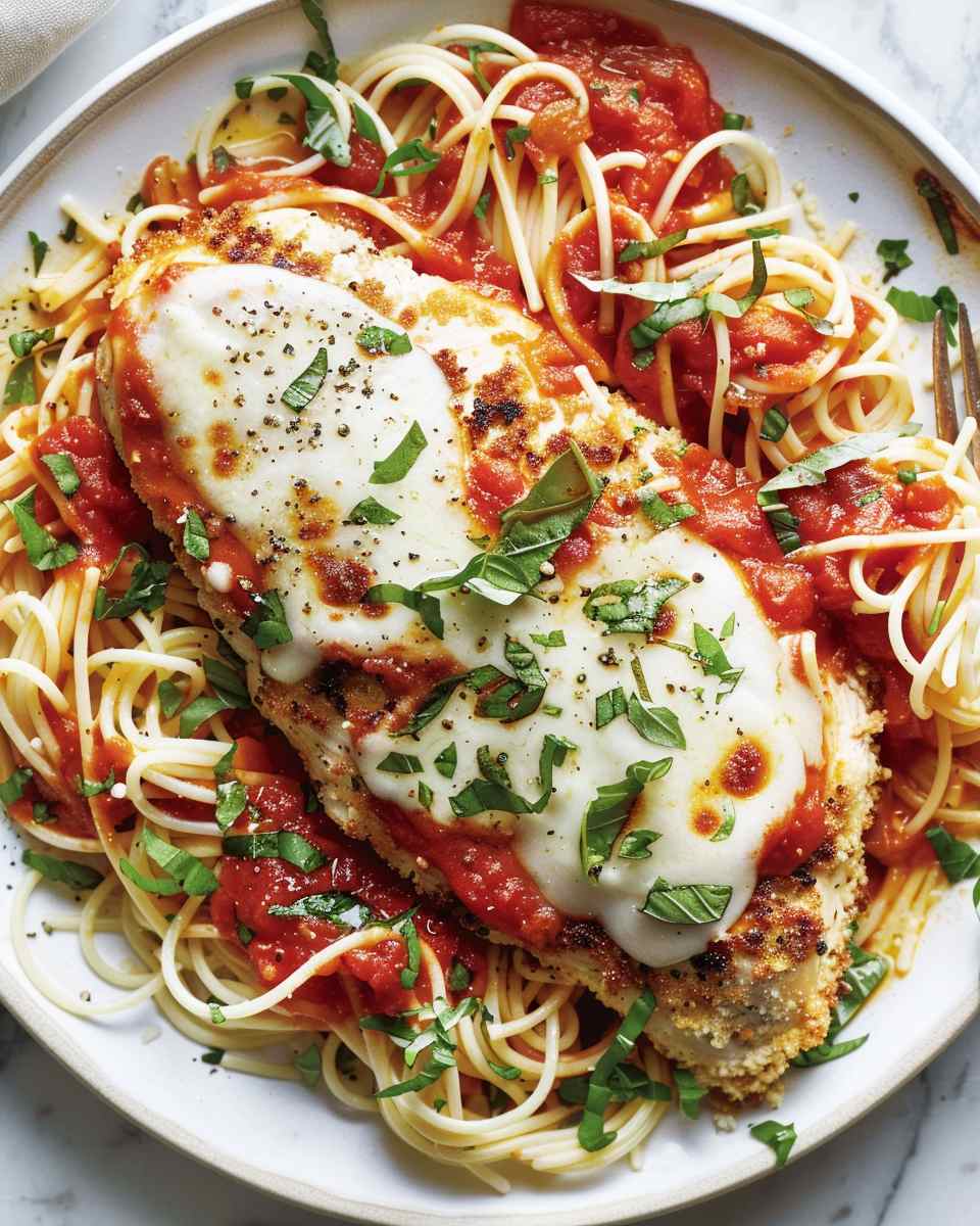 A comforting and hearty pasta dish featuring crispy breaded chicken, rich marinara sauce, and melted cheese baked to perfection.