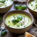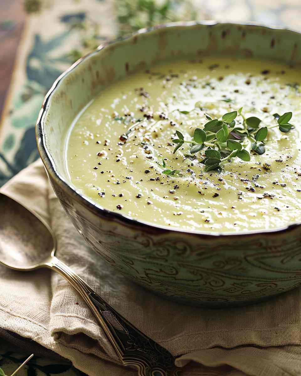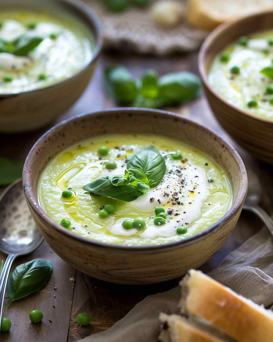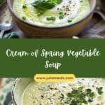 A light yet creamy soup featuring fresh spring vegetables blended into a silky, comforting dish with bright, natural flavors.