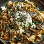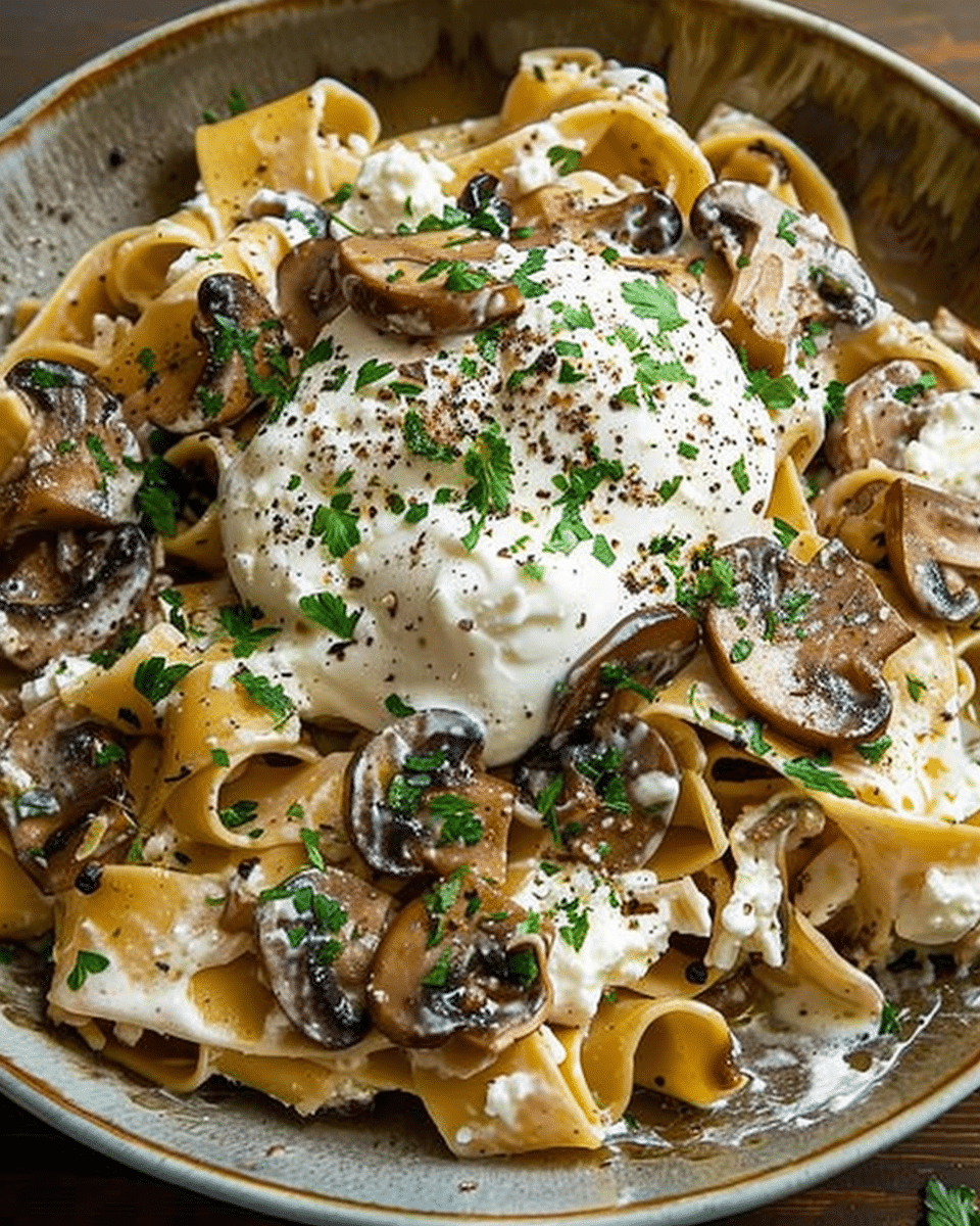 Creamy chicken and mushroom pappardelle with burrata is a rich, comforting pasta dish featuring tender chicken, sautéed mushrooms, and a velvety cream sauce topped with creamy burrata cheese. It’s an indulgent, restaurant-style meal made easily at home.