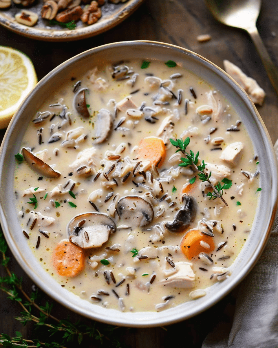 Creamy chicken and wild rice mushroom soup is a comforting, hearty dish made with tender chicken, nutty wild rice, earthy mushrooms, and a rich, herb-infused broth. Perfect for cold nights or cozy meal prep, this creamy soup is satisfying, nourishing, and packed with rustic flavor in every bite.