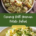 A creamy dill German potato salad made with tender potatoes tossed in a tangy dressing of mayonnaise, sour cream, Dijon mustard, and fresh dill. This comforting side dish combines soft textures with bright herbal flavors and is perfect alongside grilled meats or sandwiches.