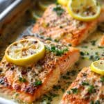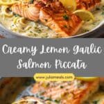 Creamy lemon garlic salmon piccata is a bright and comforting dish made with pan-seared salmon fillets simmered in a rich lemon-garlic cream sauce with capers and herbs. It’s elegant yet easy enough for weeknights.
