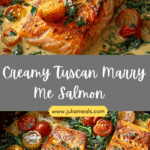 Creamy Tuscan Marry Me Salmon is a rich and elegant dish that combines seared salmon fillets with a luscious sun-dried tomato cream sauce, fresh spinach, garlic, and Parmesan. It’s the kind of meal that looks fancy enough for a date night but is easy enough for a quick weeknight dinner. I love how the flavors melt together—tangy, savory, and creamy all at once.