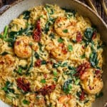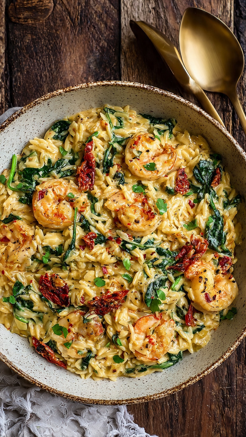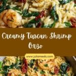 This Creamy Tuscan Shrimp Orzo is rich, comforting, and packed with bold, sun-drenched flavors. Tender orzo is simmered in a creamy garlic-Parmesan sauce with sun-dried tomatoes, spinach, and sautéed shrimp for a quick, elegant one-pan meal that tastes like Tuscan risotto but is faster and easier.