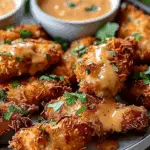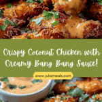 Crispy coconut chicken with creamy bang bang sauce is a flavorful and satisfying dish featuring juicy chicken strips coated in a golden coconut crust, served with a spicy-sweet dipping sauce. Perfect for dinner, appetizers, or entertaining.