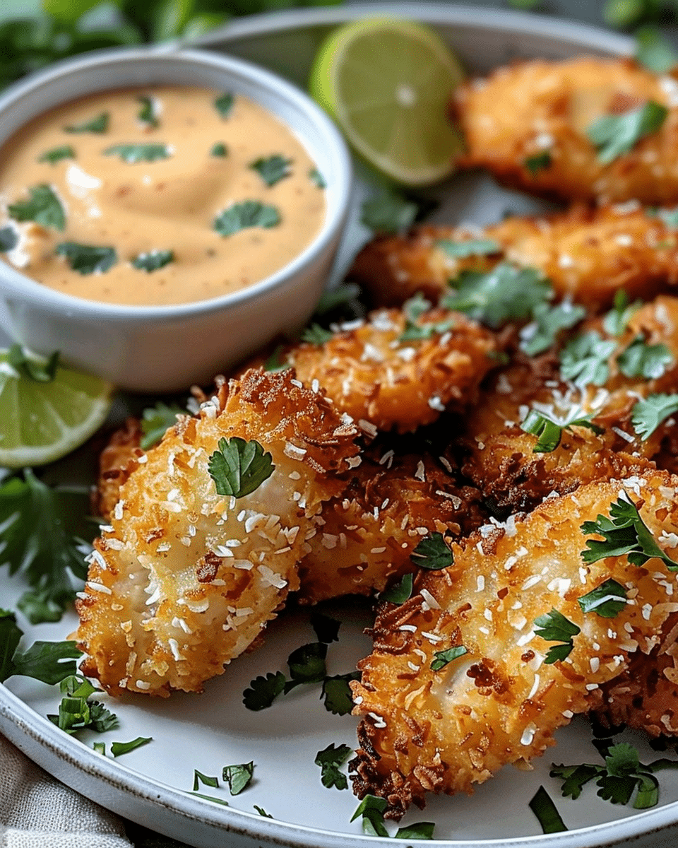Sometimes I use chicken thighs for extra juiciness, or swap the chicken for shrimp for a crispy coconut shrimp version. If I want to make it lighter, I use Greek yogurt instead of mayo in the sauce. I’ve also tried adding a bit of garlic powder or paprika to the breading for an extra layer of flavor.