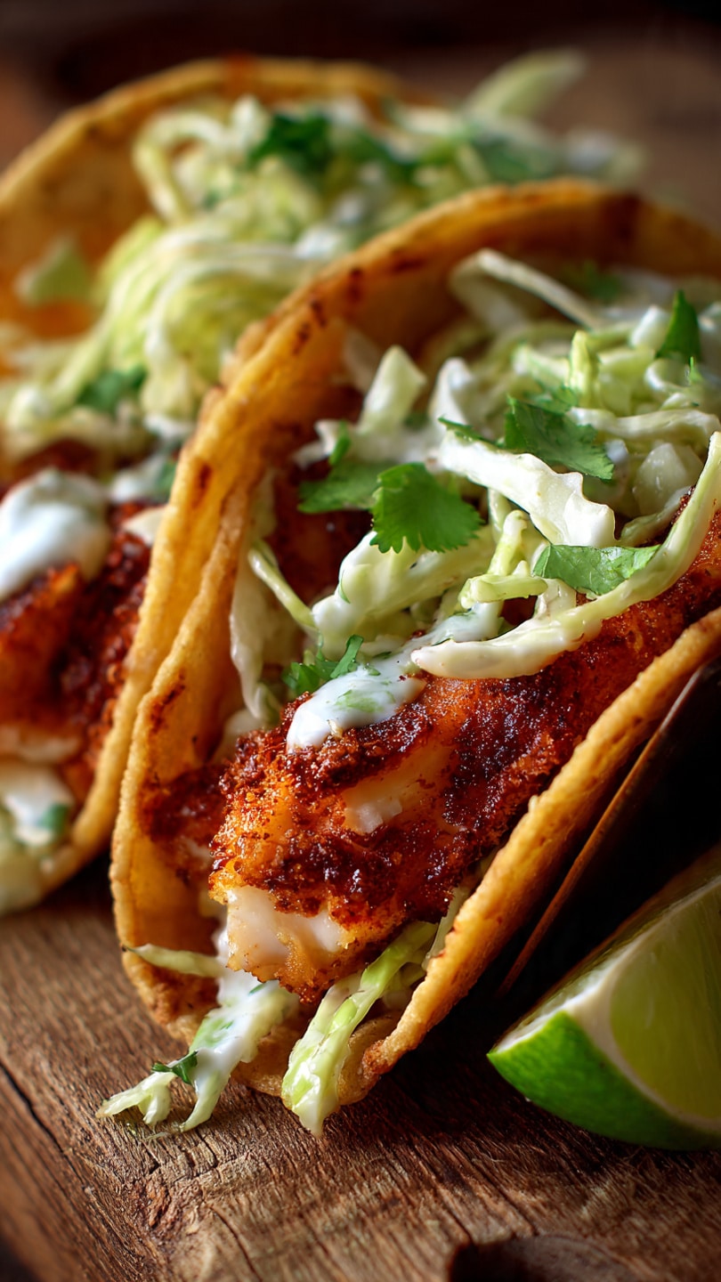 Crispy fish tacos are a flavor-packed dish featuring golden fried fish fillets tucked into warm tortillas and topped with slaw, creamy sauce, and fresh lime. Perfect for taco night or casual get-togethers, they offer a satisfying blend of textures and bold, zesty flavors.