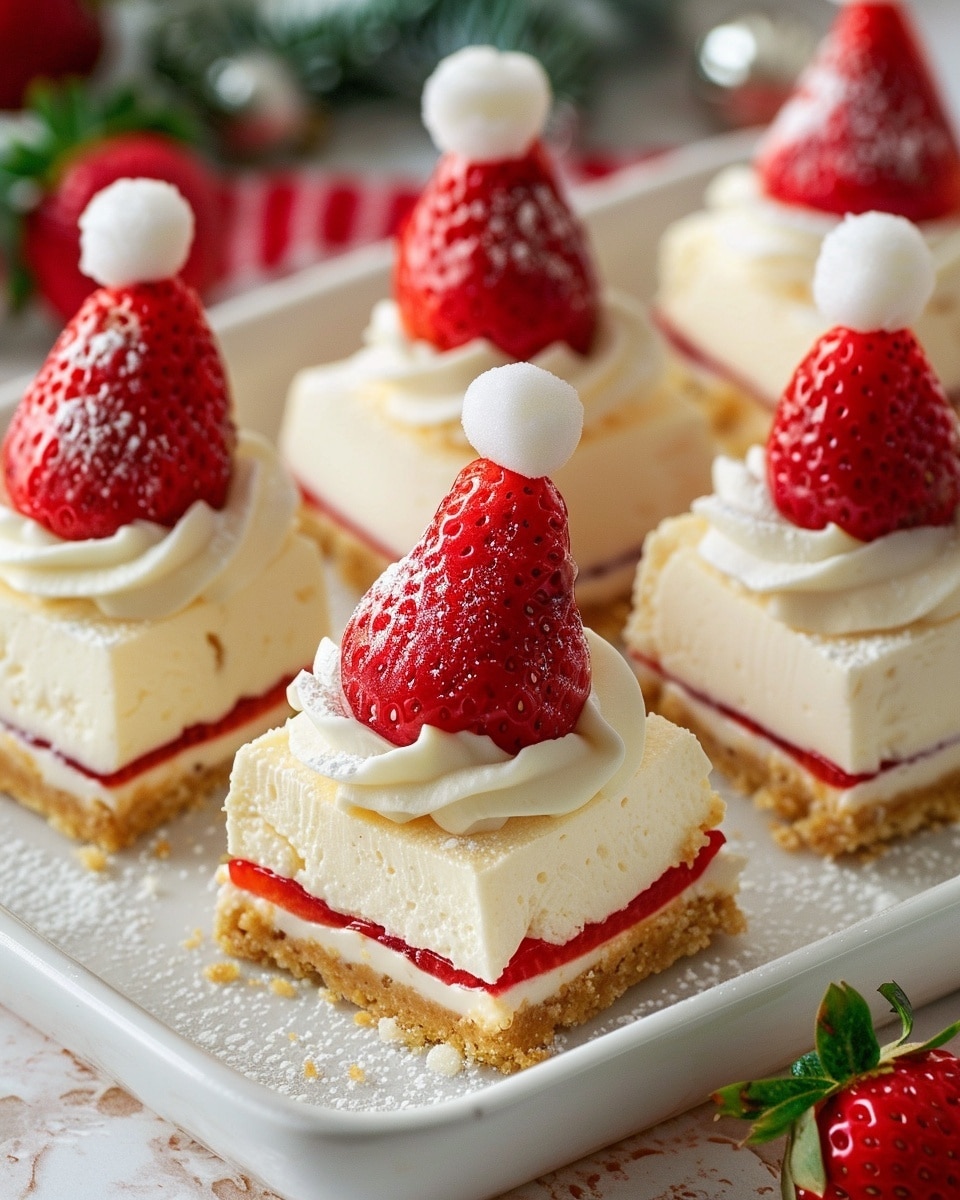 - Just before serving, I cut the squares and top each one with a fresh strawberry. I sometimes add a little whipped cream on the tip to complete the Santa hat look.