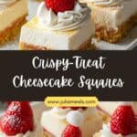 These Crispy-Treat Cheesecake Squares combine the nostalgic crunch of marshmallow rice cereal treats with a rich, creamy cheesecake layer. Topped with fresh strawberry “Santa hats,” they’re the perfect festive dessert for holiday parties and easy to make ahead.