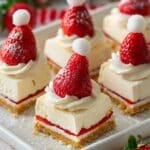 These Crispy-Treat Cheesecake Squares bring together the best of two dessert worlds — the gooey, nostalgic crunch of marshmallow rice cereal treats and the rich, creamy indulgence of cheesecake. Topped with fresh strawberries shaped like Santa hats, this recipe is festive, fun, and surprisingly easy to make.