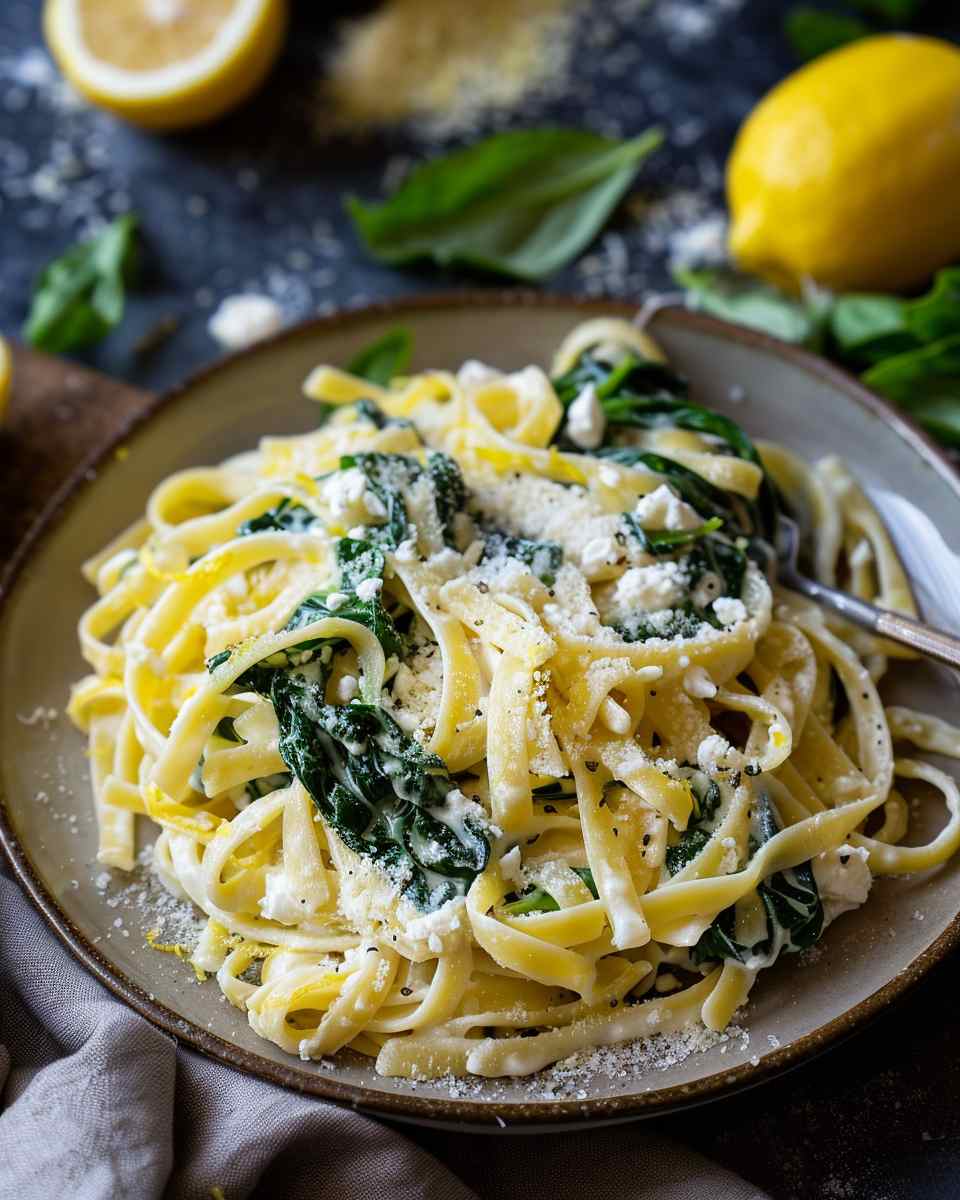 A fresh and creamy pasta dish combining lemony ricotta, vibrant spinach pesto, and tender chicken for a flavorful and satisfying meal.