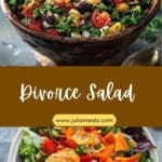 Divorce Salad is a vibrant, flavor-packed salad made with crisp veggies, creamy avocado, beans, cheese, seeds, and dried fruit, all tossed in a zesty vinaigrette. It’s light, refreshing, and totally crave-worthy — perfect as a side or main dish.