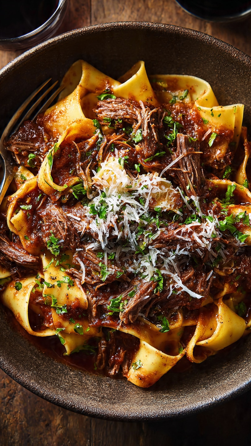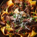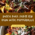 Dutch oven short rib ragu with pappardelle is a rich, slow-cooked dish featuring tender braised short ribs in a savory tomato and wine sauce. Served over wide ribbons of pasta and topped with Parmesan, it’s a comforting, restaurant-worthy meal perfect for cozy nights or special occasions.