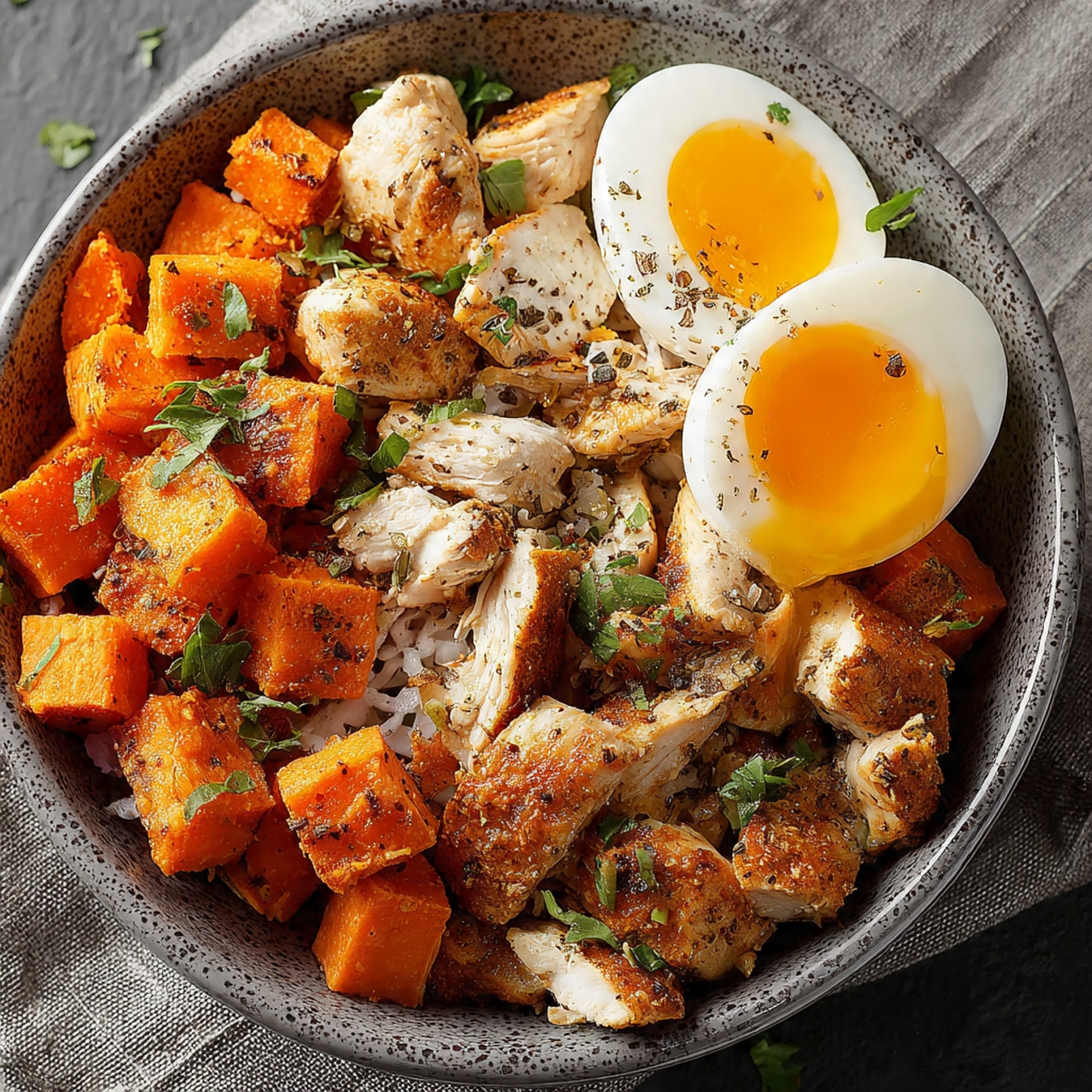 I sometimes swap the sweet potatoes for roasted butternut squash or roasted cauliflower. I also like adding avocado or sautéed spinach for extra richness and greens. When I want a little extra flavor, I sprinkle smoked paprika or chili flakes over the bowl. For a different protein, I occasionally use salmon, turkey, or tofu.
