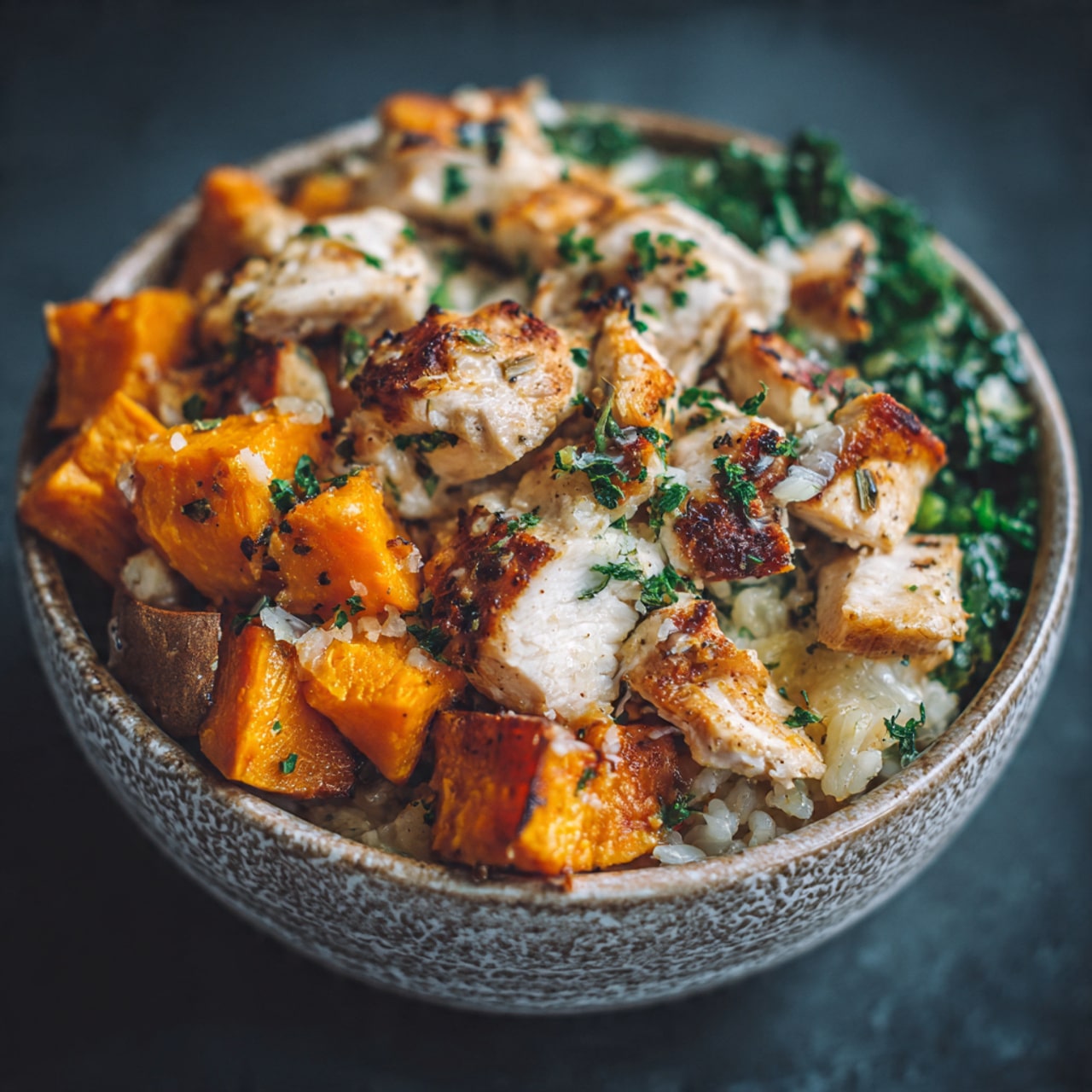Wholesome chicken and sweet potato bowls with roasted sweet potatoes, seasoned chicken, fresh vegetables, and a simple dressing, perfect for a nutritious and colorful meal.