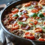 A hearty low carb pizza casserole made with seasoned meat, rich tomato sauce, melted cheese, and classic pizza toppings baked into a comforting crustless dish.