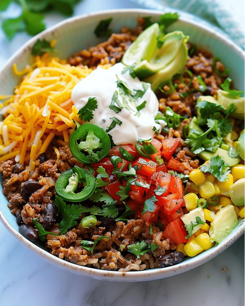 Easy Taco Rice Bowl is a hearty, flavor-packed one‑bowl meal that brings together seasoned meat, rice, beans, veggies, cheese, and fresh toppings — delivering all the deliciousness of tacos in a quick, customizable bowl. It’s perfect for weeknight dinners, meal prep, or a build‑your‑own taco night with friends or family.